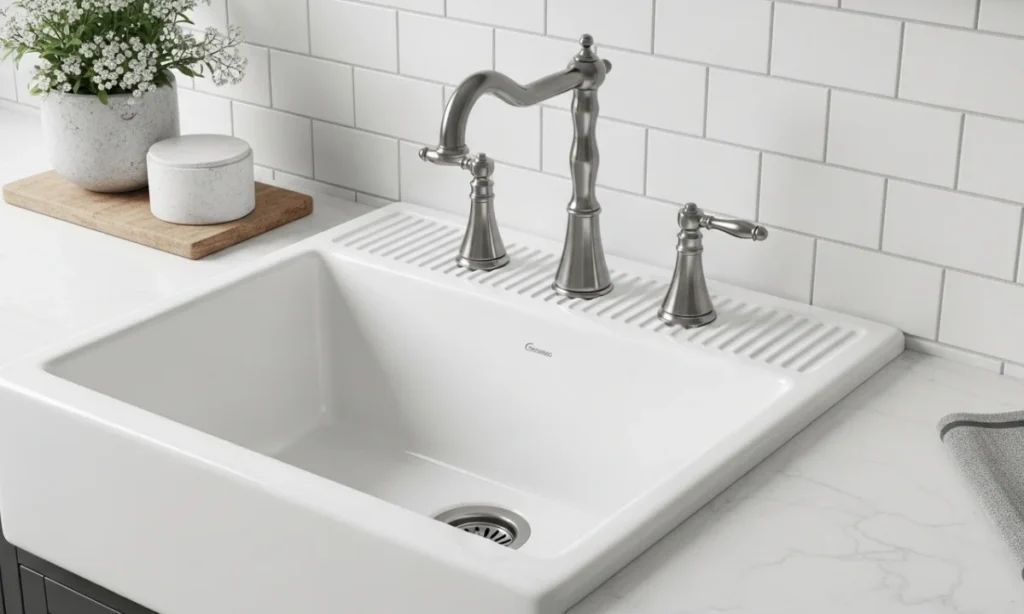 A classic ceramic or porcelain sink is a choice you can’t go wrong with. Known for being durable, easy to maintain, and stain-resistant, it is a timeless and sensible option. Available in many shapes and sizes, it fits effortlessly into any design, from modern farmhouse to traditional.