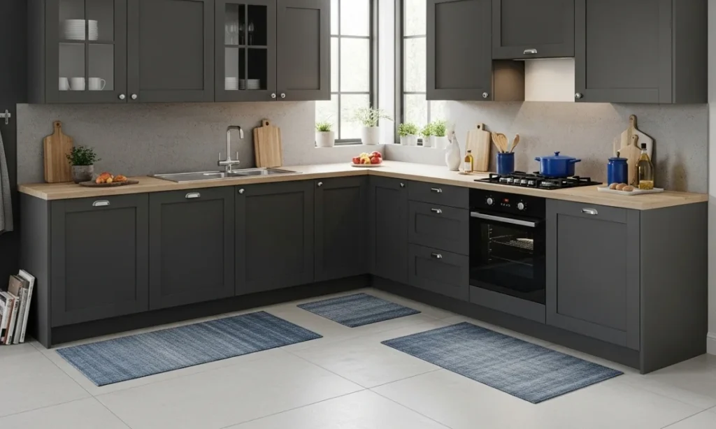 Use coordinated rugs in pairs or an oversized rug umbrella to create separated visible areas in an L-shaped design. This method adds comfort and safeguards the floor across the main work triangle effectively.
