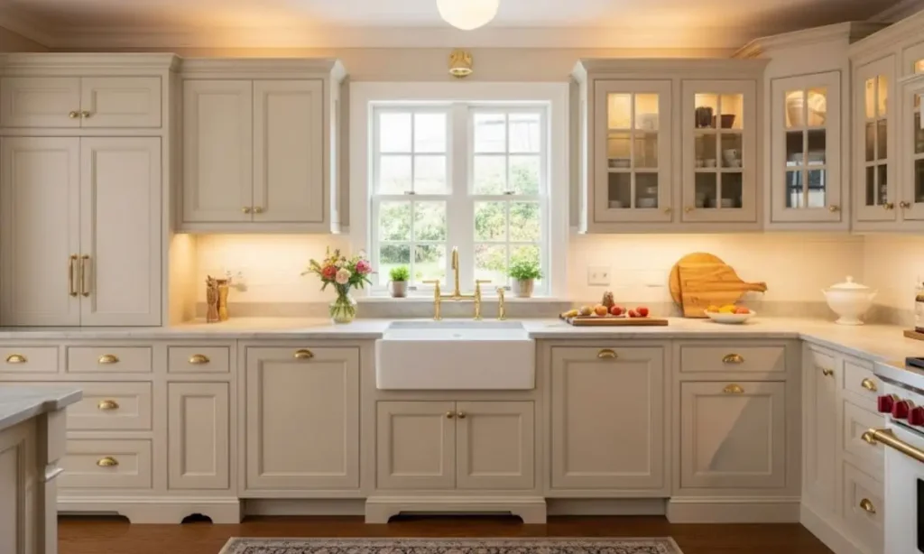 A creamy off-white paint serves as a warm, luxurious canvas for elegant brass hardware. Premium paints with self-leveling properties guarantee an exceptionally smooth surface that beautifully highlights metallic accents.