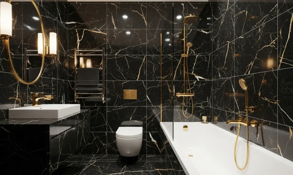 Black tiles with gold or white veins can be used to add breath taking sequences of luxury, when used on marble floors, countertops or as a complete marble shower. The instant touch of marble will elevate the sophistication of any bathroom while its nostalgic qualities make your design classic and timeless.