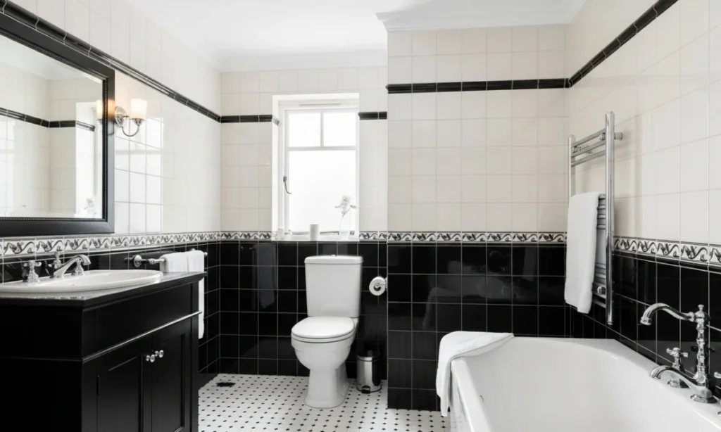 Channel the roaring twenties by infusing your black bathroom with Art Deco style. Use black tiles to create bold geometric patterns on the floor or as a feature wall. Complement this with gold or brass fixtures, scalloped shapes, and a sunburst mirror to create a glamorous, high-contrast, and historically rich design.