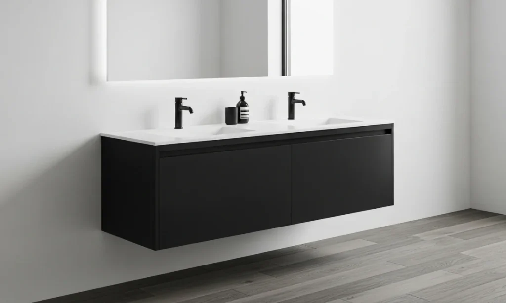 A floating black bathroom vanity creates a clean, uncluttered look that enhances a modern design. This approach makes the room appear more spacious by exposing the floor beneath.Matched with a sleek polished edge and modern faucets, the result is gentle and balanced in style, demonstrating the harmony between minimalist beauty and practicality.