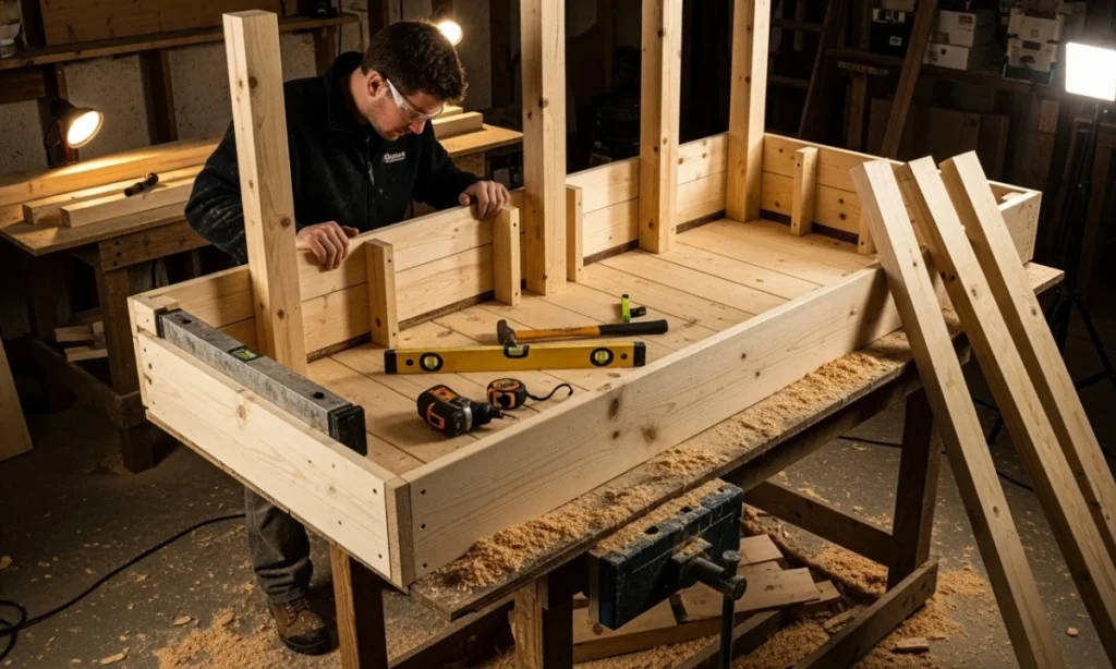 Construct the primary frame of the bar using timber. Begin with the counter frame and the support posts.Each element must be leveled and secured properly.