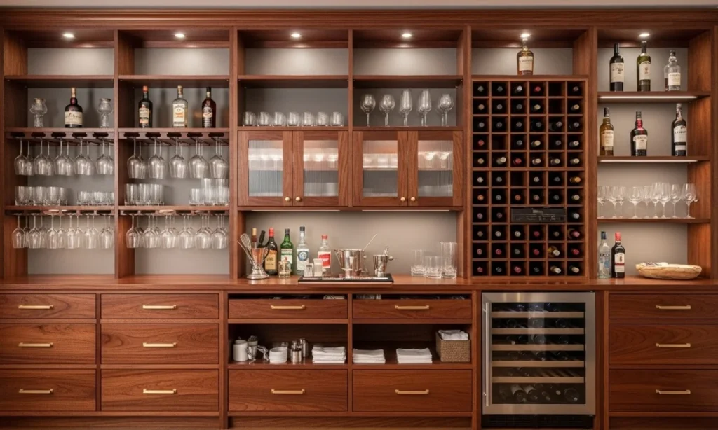 2. Ignoring Storage Needs: Forgetting to include enough shelves, cabinets, or drawers for bottles, glasses, and bar tools makes your bar messy and hard to use.