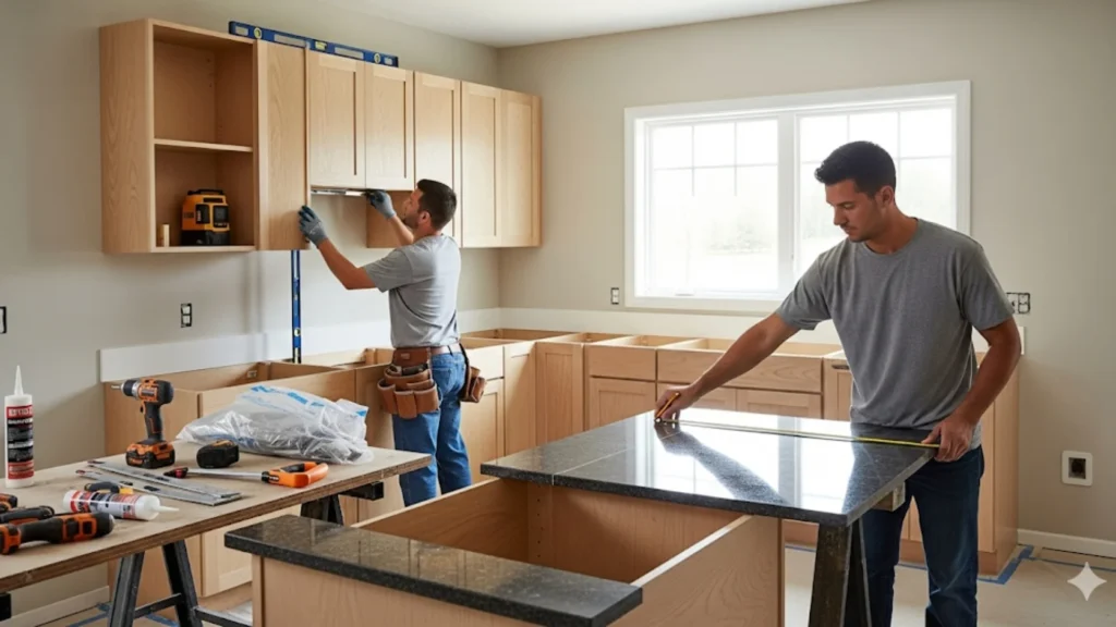 Install kitchen cabinets following proper measurements. Add countertops after cabinet installation to ensure precise fitting and support.