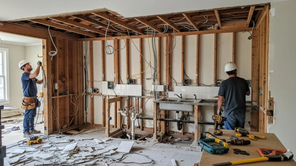 Remove old fixtures, cabinets, and flooring. Complete electrical, plumbing, and structural updates. Schedule professional inspections before proceeding.
