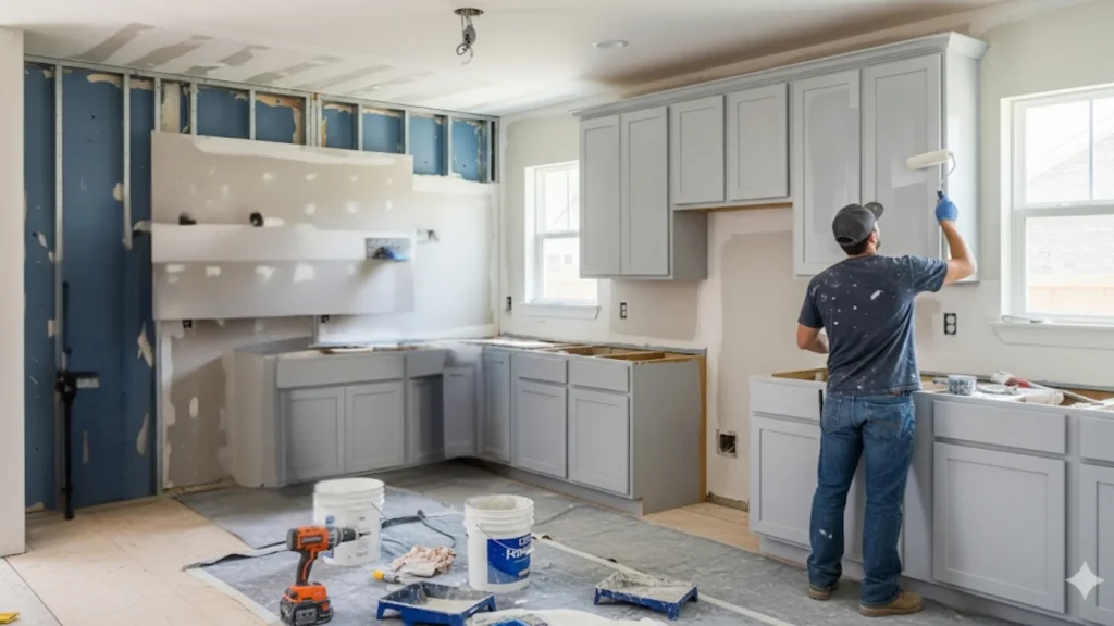 Install new drywall, patch surfaces, and paint walls and cabinets. Complete this before flooring installation to avoid damage.