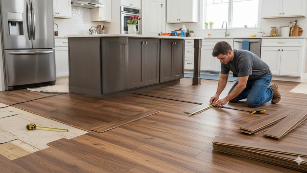 Place flooring beneath cabinets and appliances rather than around them. This approach adds resale value and provides flexibility for future changes.