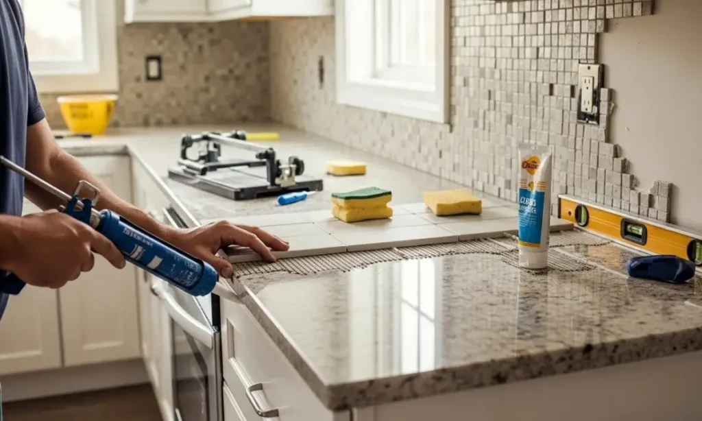 Step 5: Countertops and Backsplash – Counter Top & Backsplash: Always put counter tops in before adding a back splash whether you are using tile, or panel coverings. Be sure to seal joints and allow proper time for all adhesives to cure..