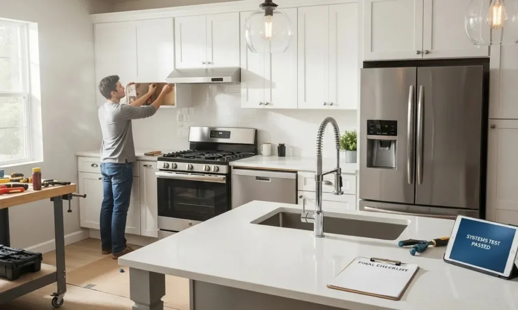 Step 6: Final Touches and Appliances – Finishing Touches & Appliances : Install each appliance, cabinet hardware, faucets, and lights last , but not least. Clean everything! Test all the plumbing and electrical systems to make sure everything is working properly.
