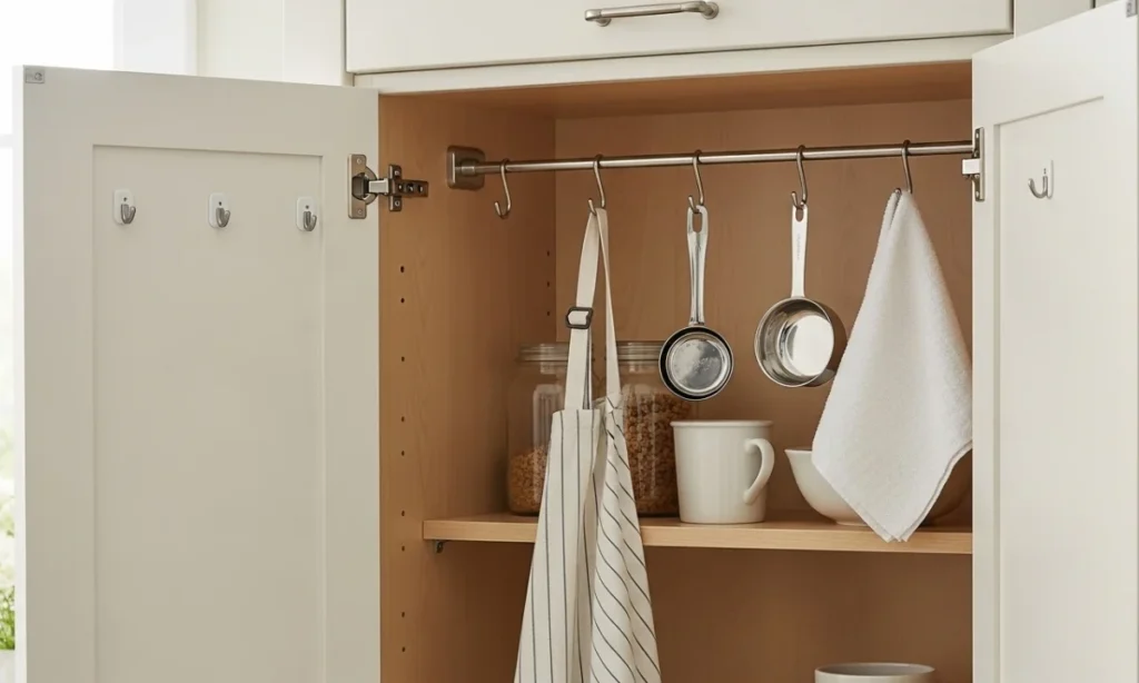 Use tiny stick-on hooks on the bespoke cabinets on the inside of the doors. You can utilize these areas and hooks to hang your aprons, measuring spoons, or tea towels.