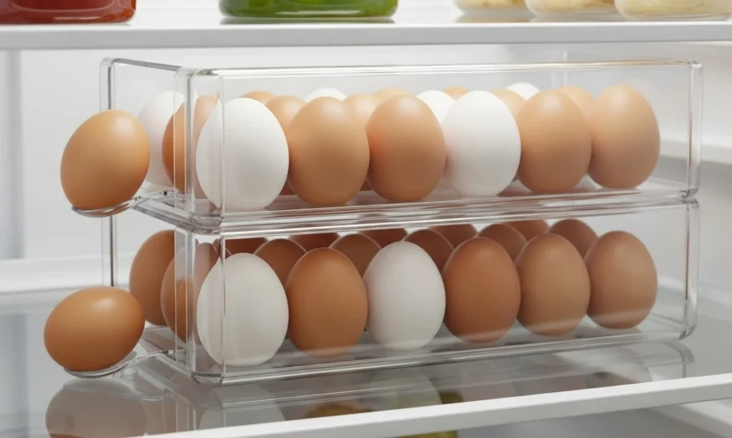 Swap bulky cartons for double-decker egg containers. They save shelf space and auto-roll eggs forward like a vending machine.