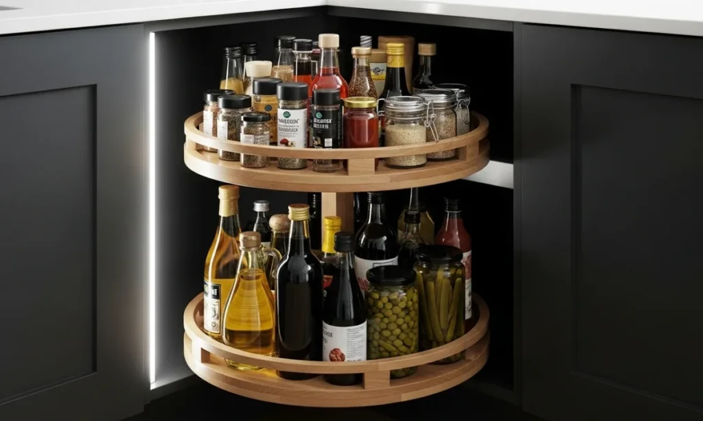 Place turntables in deep cabinets or the fridge. They make condiments, oils, and jars visible and accessible.