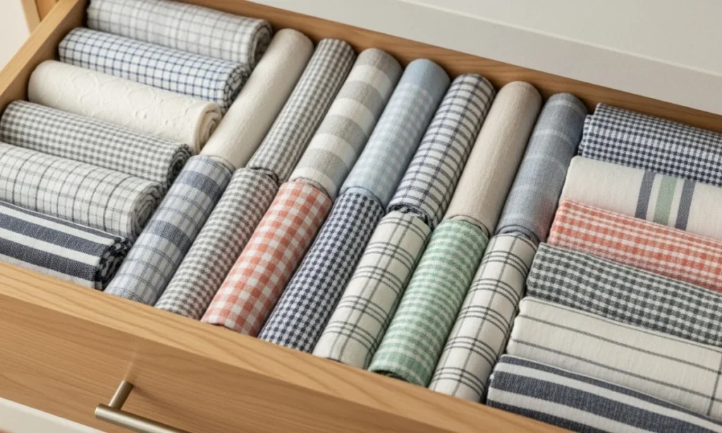 Instead of folding, roll tea towels and line them up in the drawer. You’ll fit more and see everything at a glance.