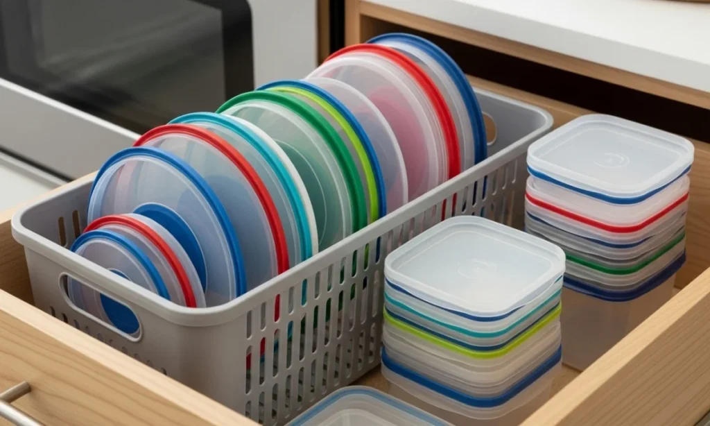 Nest containers and file lids vertically in a basket like a mini filing cabinet. Suddenly, your messiest drawer feels intentional.