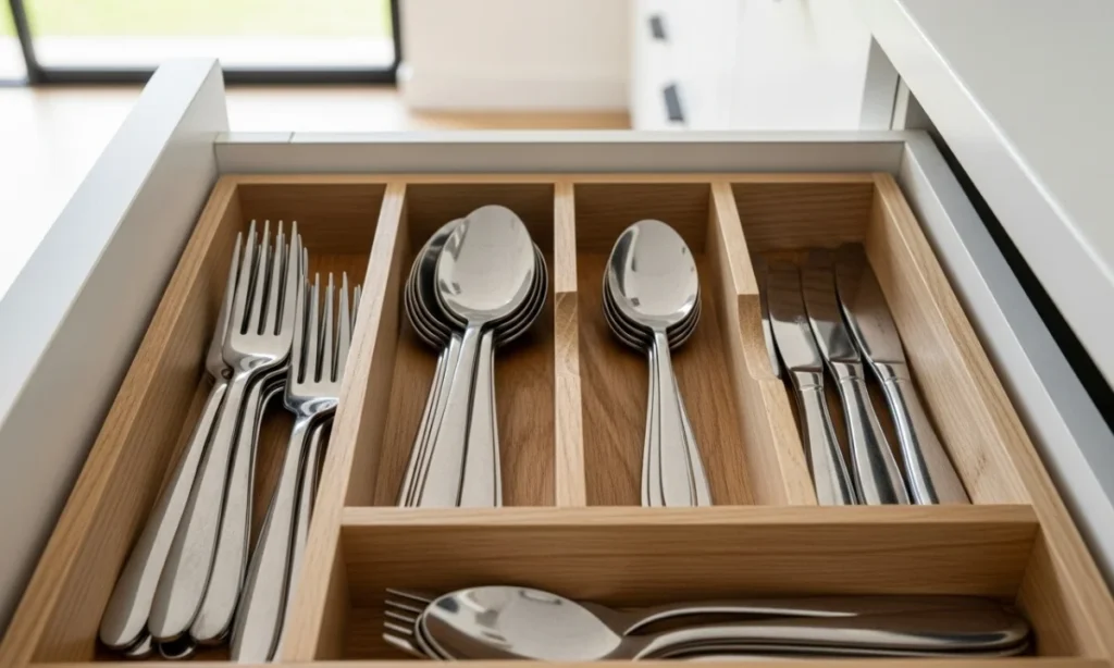 Stand cutlery upright in compartments to save space. It looks neat, fits more, and makes grabbing a fork faster.