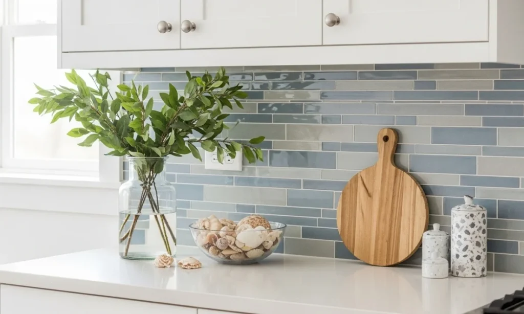 A casual, light, airy seaside vibe can be easily reached with simple, natural decor. A clear vase filled with greenery, or a bowl of shells will remind you of the coast, and works great as white kitchen counter decor ideas.