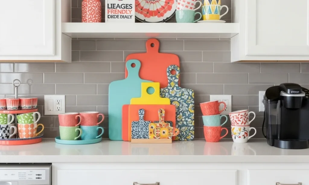 Laminate is a versatile surface for affordable style. A grouping of colorful cutting boards or a coffee station set with mismatched mugs can inject personality into your display at a low price point.