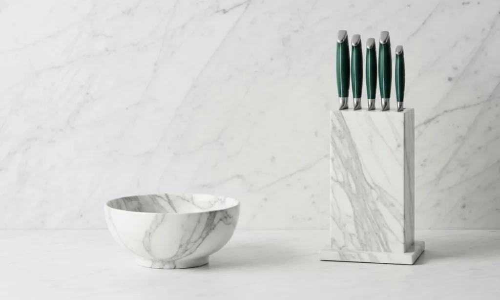 Let the wonderfulness of marble shine as the main attraction with classic accessories such as a simple ceramic fruit bowl or a fine knife block to align with the valuable feel of marble but to not battle with the marble’s aesthetic.
