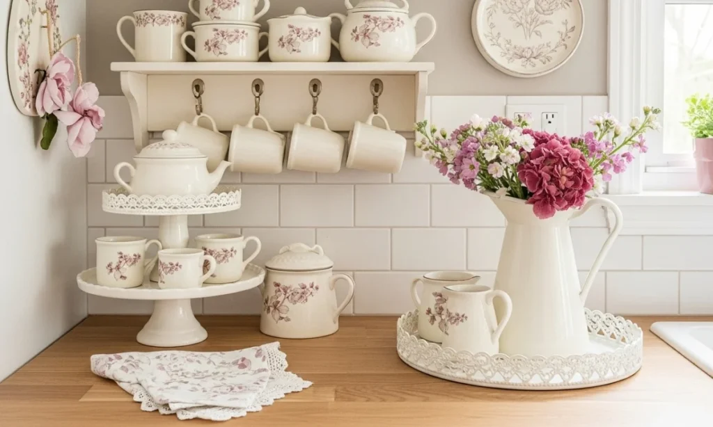Antique-inspired wares, as well as a soft color palette will lend your kitchen a warm, whimsical feel. Fresh flowers in a pitcher on a lace-edged tray also bring in the Cottagecore aesthetic, which can also be used to inspire corner kitchen counter decor ideas, creative kitchen bar counter decor ideas.