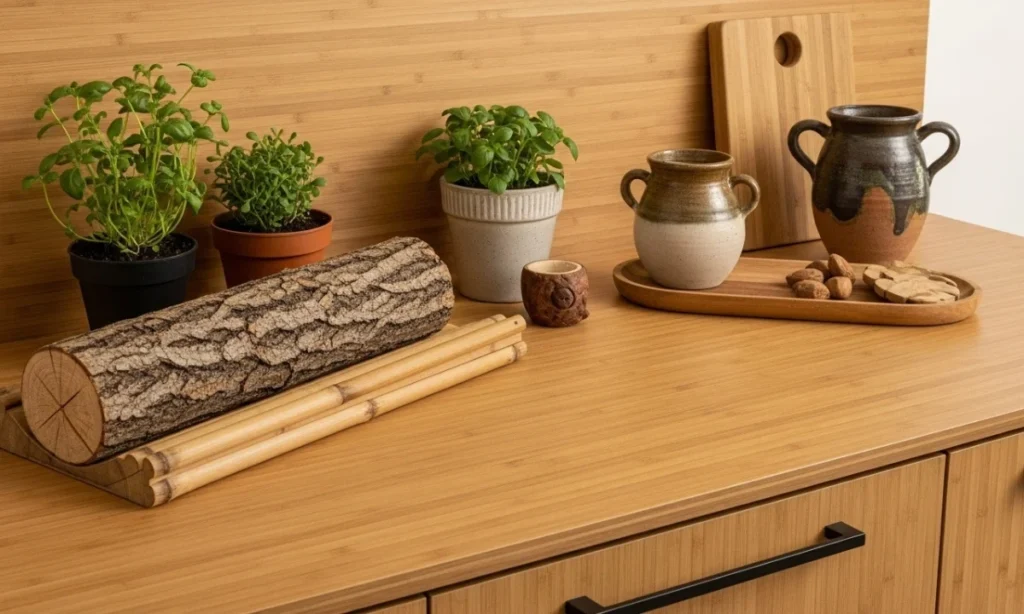 Pair sustainable bamboo with earthy logs of natural decor. Small potted herbs, handmade pottery, and other organic decor will enhance the eco-friendly ambiance and natural beauty of the countertop.