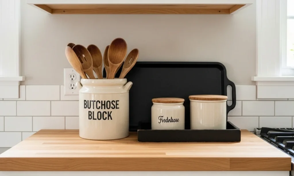 Enhance the warm, natural appeal of butcher block with classic farmhouse elements. A vintage crock holding wooden spoons creates a charming, lived-in feel perfect for this style. This includes great modern farmhouse kitchen counter decor ideas.