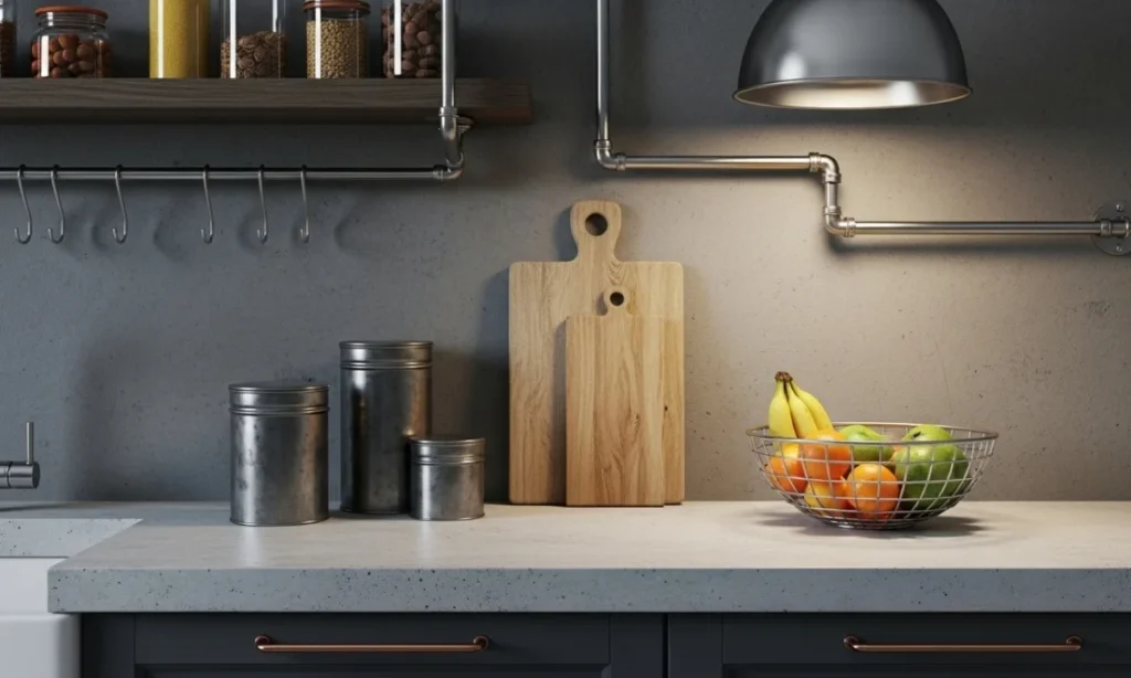 Complement the raw, utilitarian look of concrete with industrial accents. Metal containers and a basic wire basket for fruit will elevate the urban, edgy feel of the area.