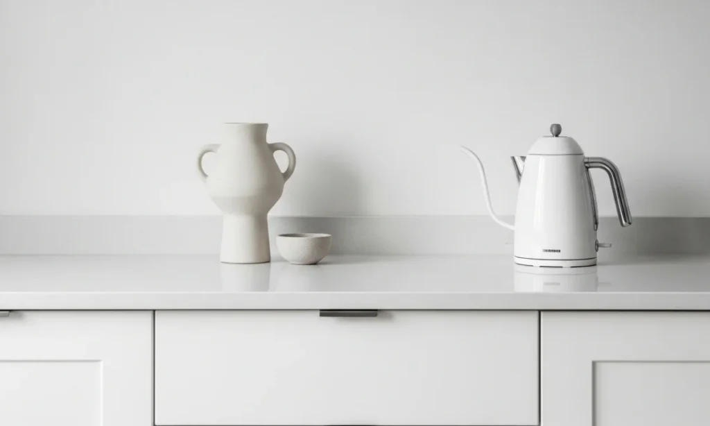 Create a calm, simple look by choosing just one or two quality items, such as a streamlined designer kettle or a singular sculptural piece of pottery that exudes the essence of minimalism.