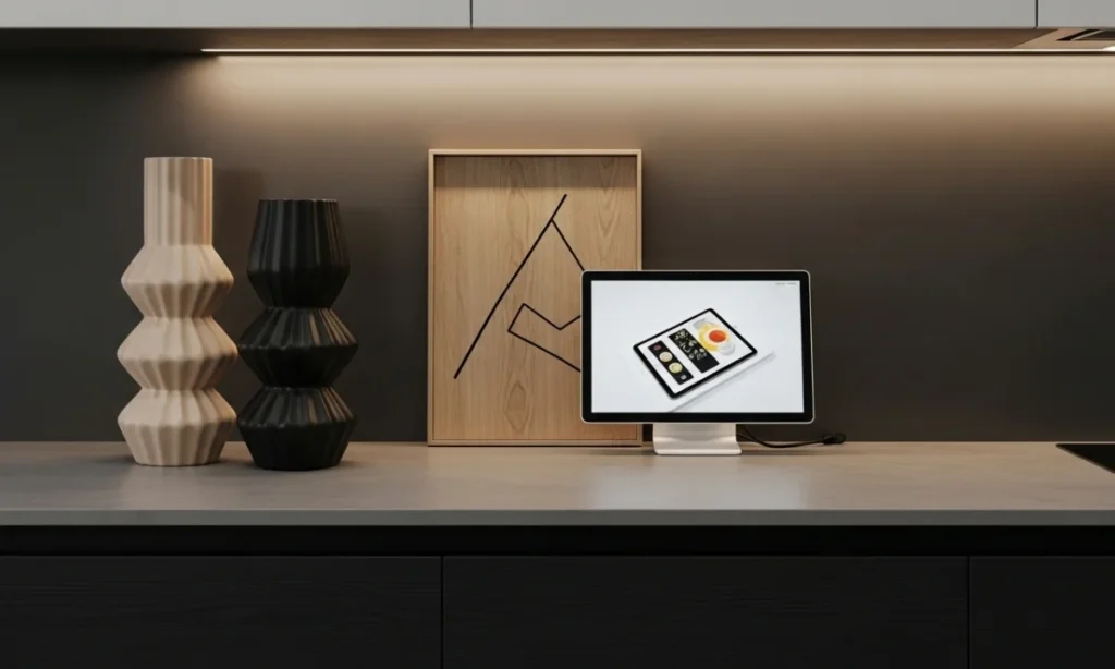 Use clean lines and geometric shapes for a more modern feel. A sculptural vase or techy smart display will help create a sleek and uncluttered feel on the counter while feeling new. These are prime modern kitchen counter decor ideas.