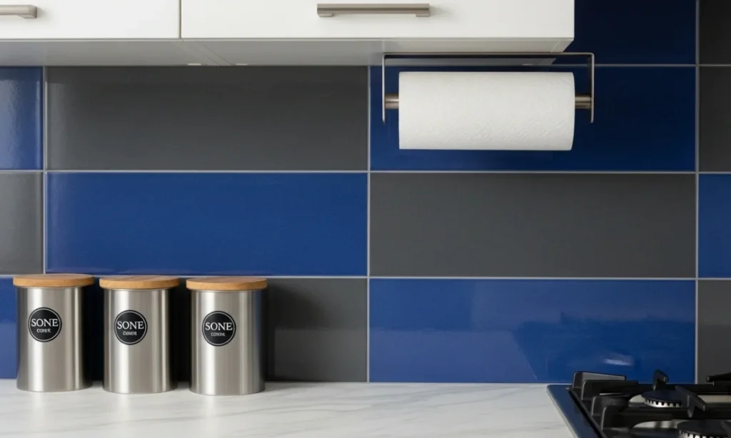 Use ceramic tile with modern stainless steel for cleanliness and professionalism. Canisters that are in line with one another or a modern stainless steel paper towel holder will create continuity in the aesthetic to the kitchen.
