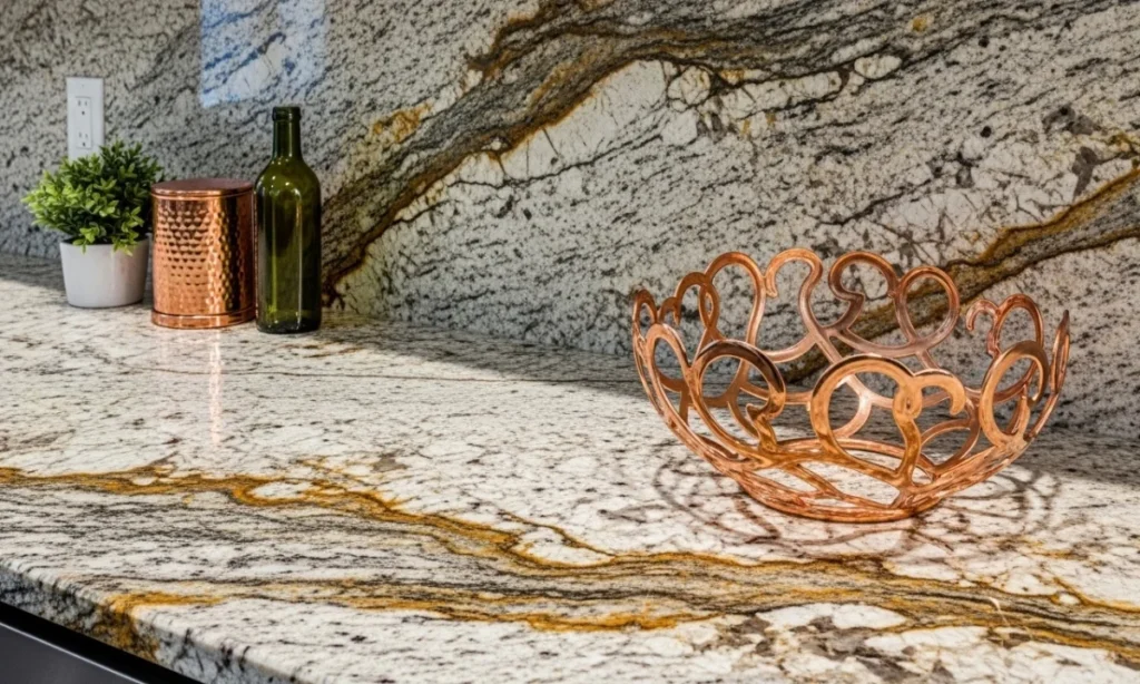 Scarves of warm copper accessories have an eye-catching contrast against the cool of natural stone of granite countertops. A copper fruit bowl or utensil holder will sculpt the warm veining in the stone.