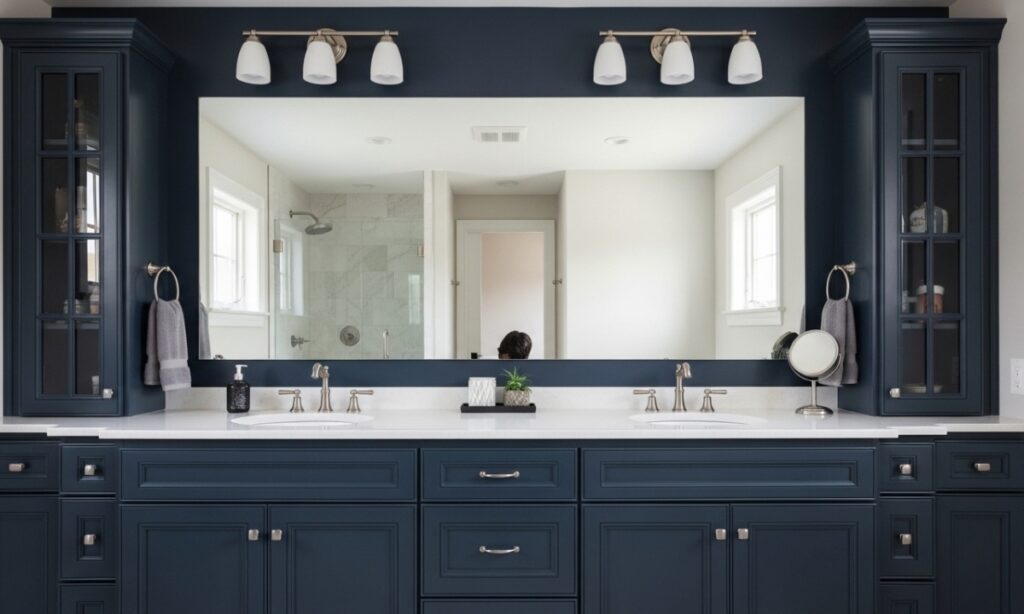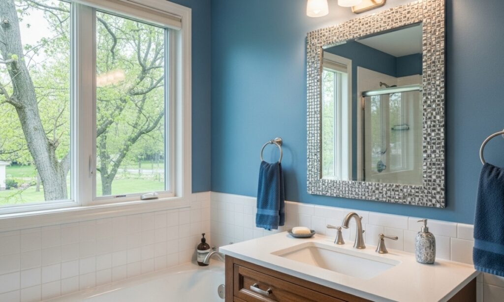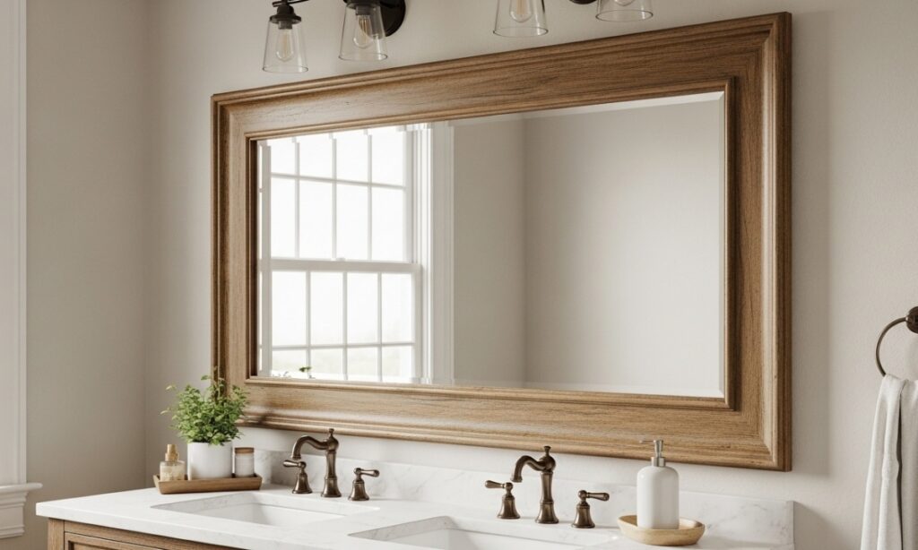 A frame uplifts your large bathroom mirror into decor. Match hardware or add texture. A prominent frame creates a focal point, enhancing rustic farmhouse or gilded glam styles.