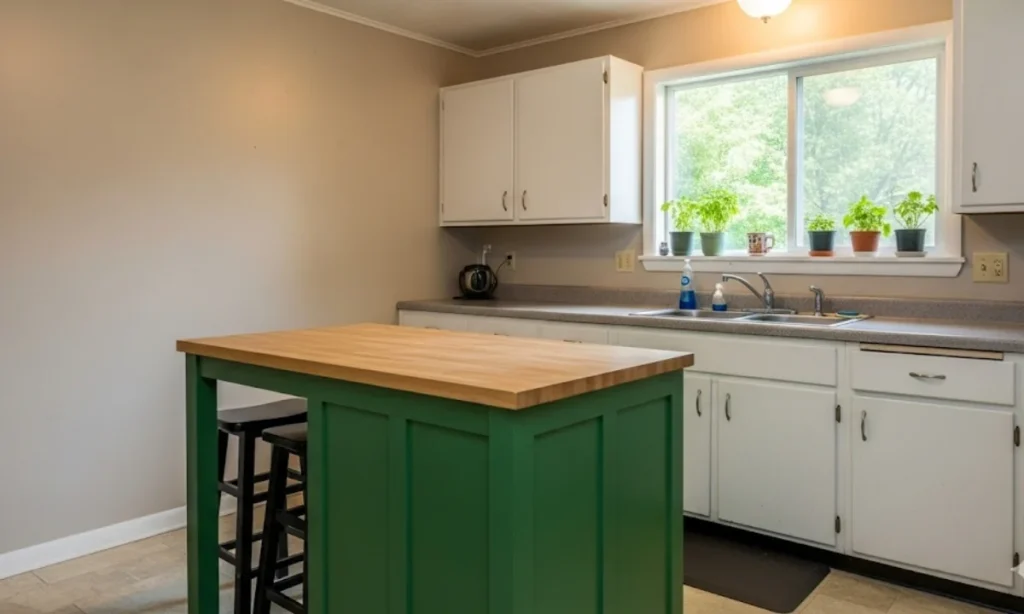 A useful kitchen island doesn’t have to break the bank. You can create a custom-appearing centerpiece by beginning with an affordable base cabinet, often found on clearance. Frame it to your desired size, clad it in an inexpensive material, and paint it a bold color for a striking focal point, ideal for a small, budget kitchen design or any compact area.