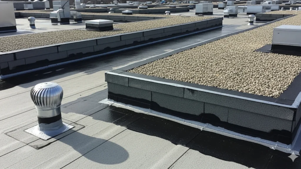 Multi-layer asphalt and tar system topped with aggregate, designed specifically for flat roofs with excellent waterproofing capabilities.